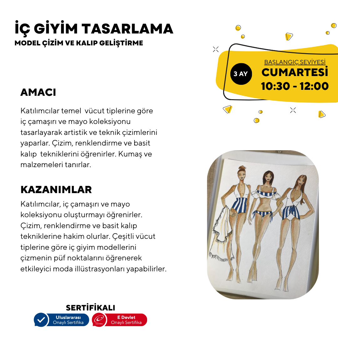 Participants will design underwear and swimwear collections according to basic body types and create artistic and technical drawings. They will learn drawing, coloring and basic pattern techniques. They will become familiar with fabrics and materials.